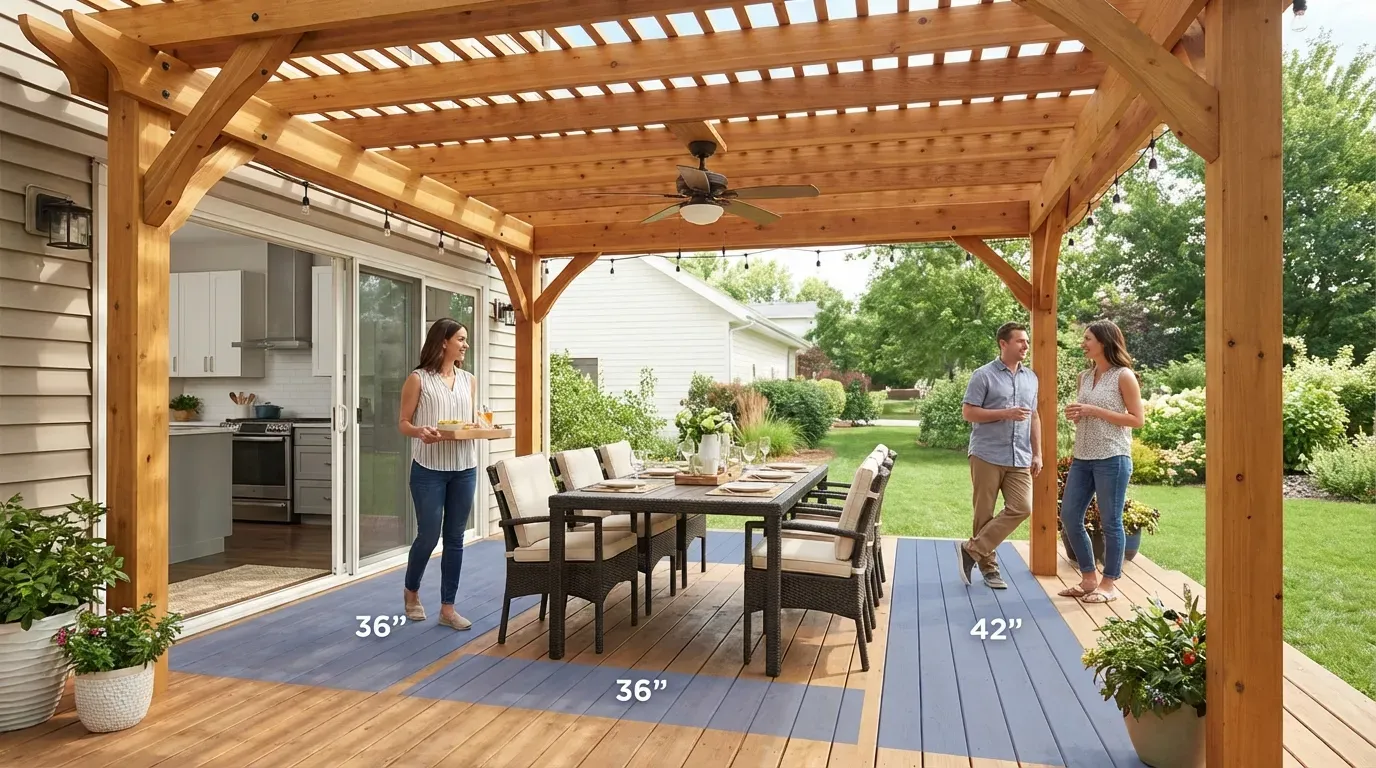 Start by measuring your furniture and adding 36 inches of clearance on all sides for dining, or 42–48 inches for kitchen work aisles. The post-to-post interior must accommodate these combined dimensions. Then add 18 inches per side for the overhang to get the nominal pergola size.